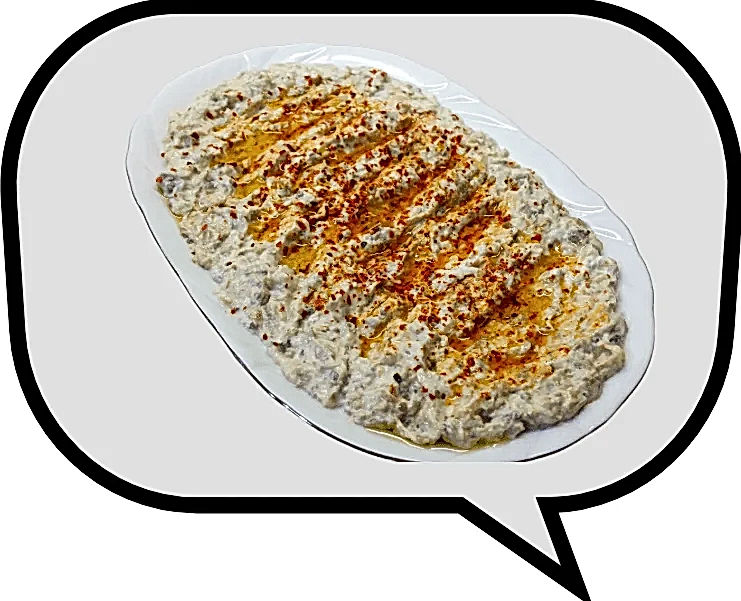 Közlenmiş patlıcan, biber, yoğurt.Smoked Eggplant, Pepper, Garlic, Yogurt and Olive Oil.Geröstete Auberginen, Pfeffer, Joghurt.Aubergine fumée, poivre, yaourt.Жареный баклажан, перец, йогурт.باذنجان مشوي، فلفل، زبادي.熏茄子,辣椒,大蒜,酸奶。焼きナス、ピーマン、ニンニク、ヨーグルト。